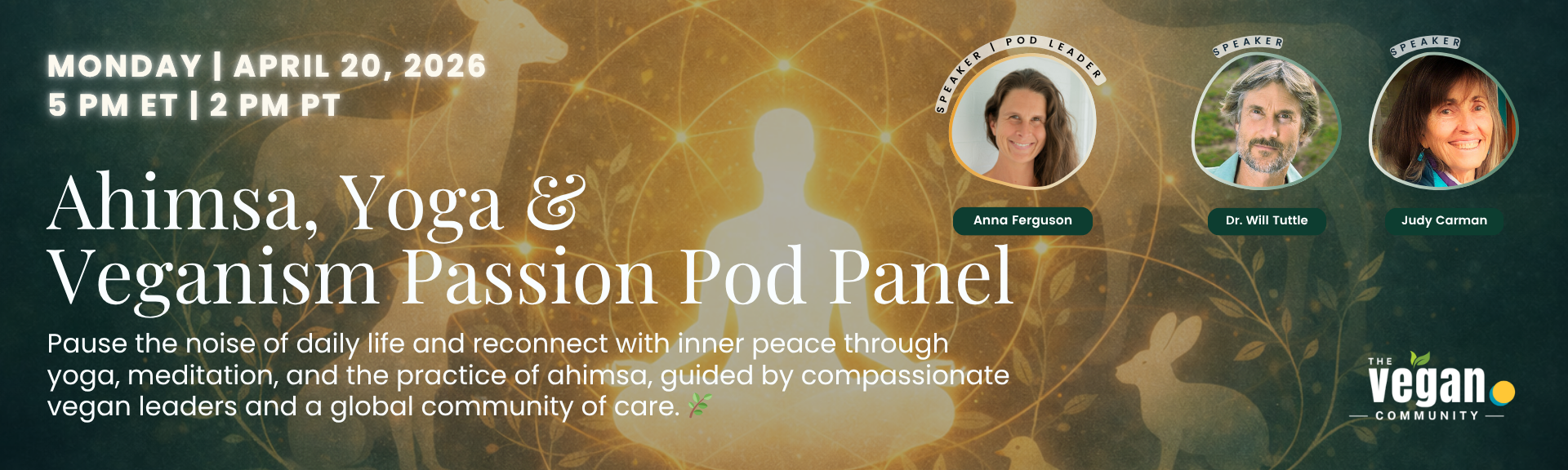 Anna Ferguson, leader of the Ahimsa, Yoga & Veganism Passion Pod, is joined by Will Tuttle, PhD—visionary educator, musician, and internationally bestselling author of The World Peace Diet—together with Judy McCoy Carman, activist and author of Peace to All Beings and Homo Ahimsa.